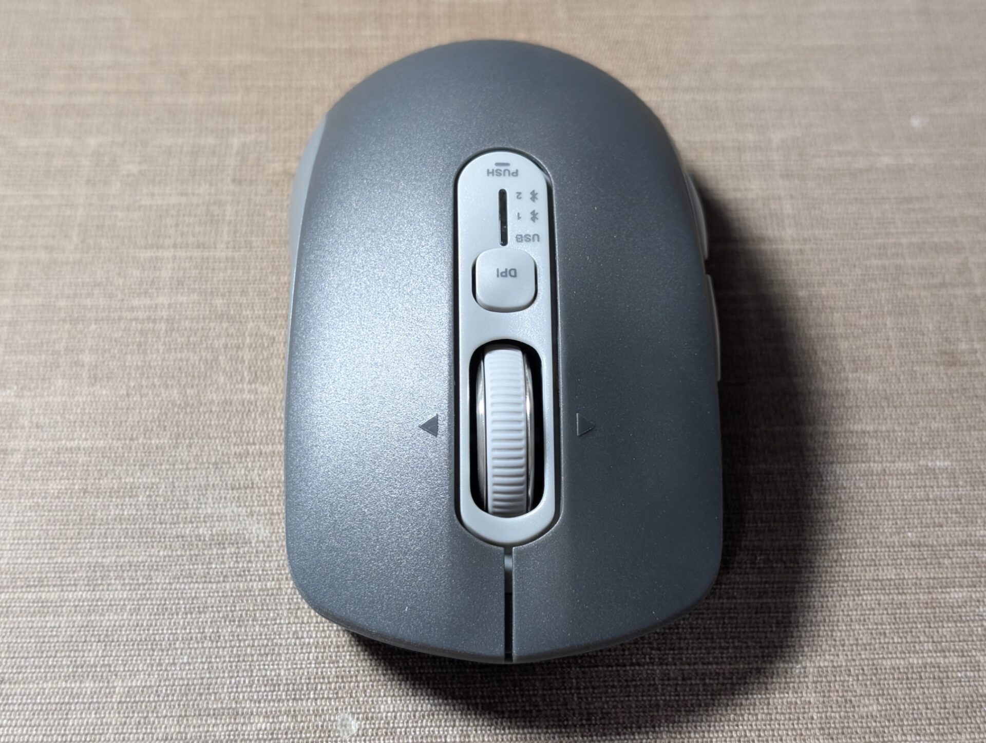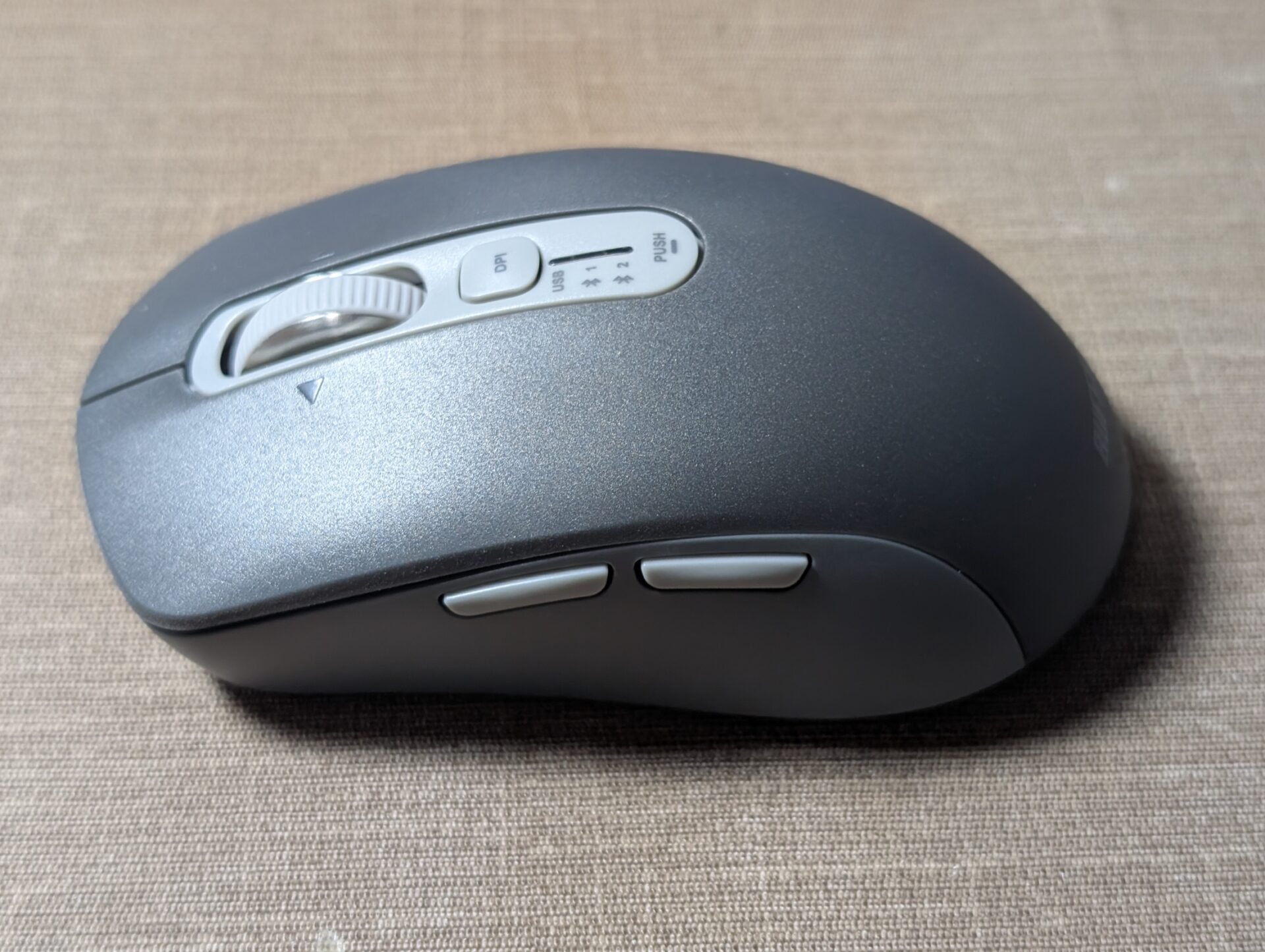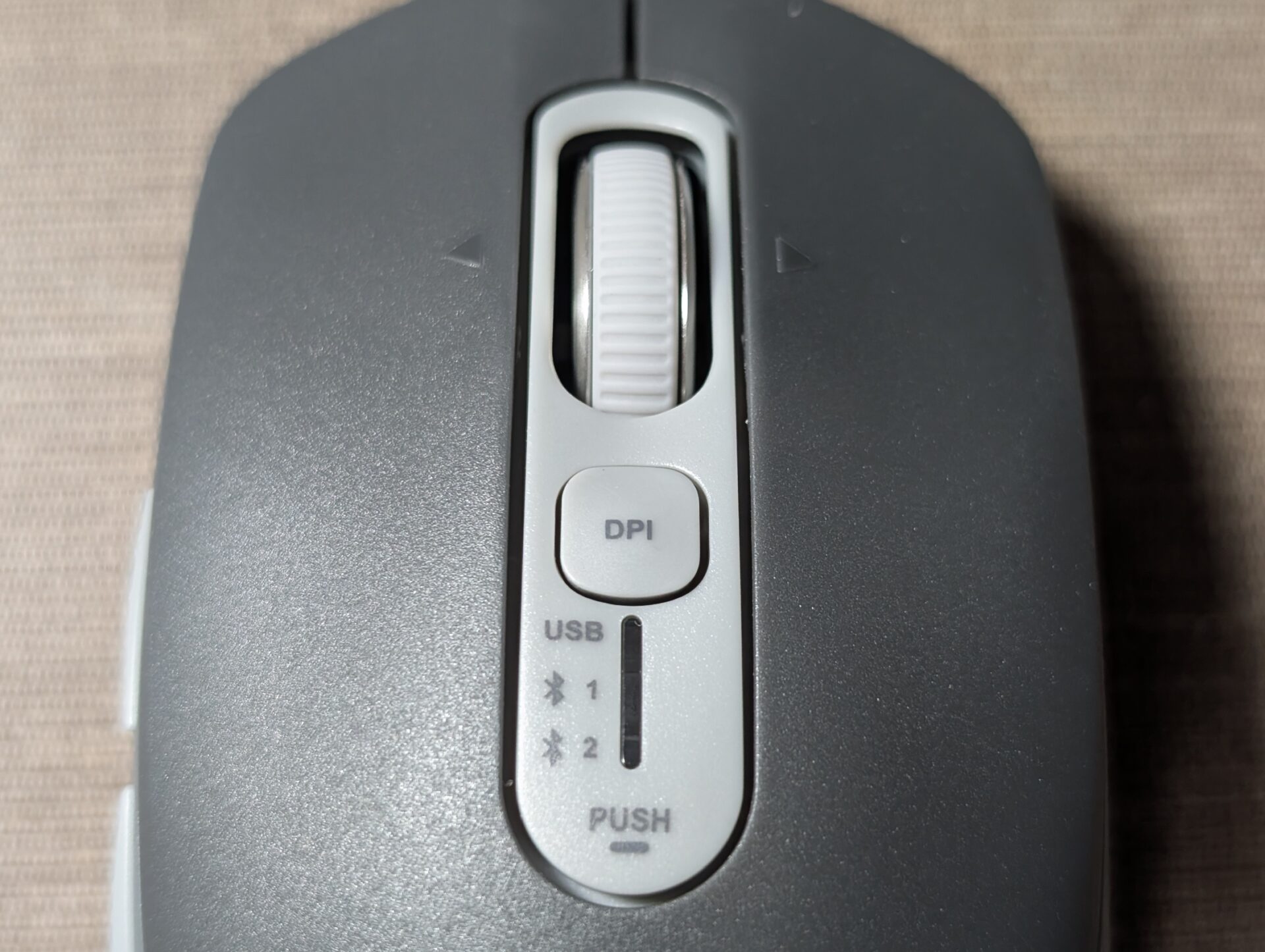BSMBB700BKのDPI切り替えボタンは上部にあります。解像度の割り当ては変更できません。残念。とはいえ、3,200DPIなら4K画面での作業も十分です。難点はBSMBB300と同じく、今のDPIがわからないこと…。