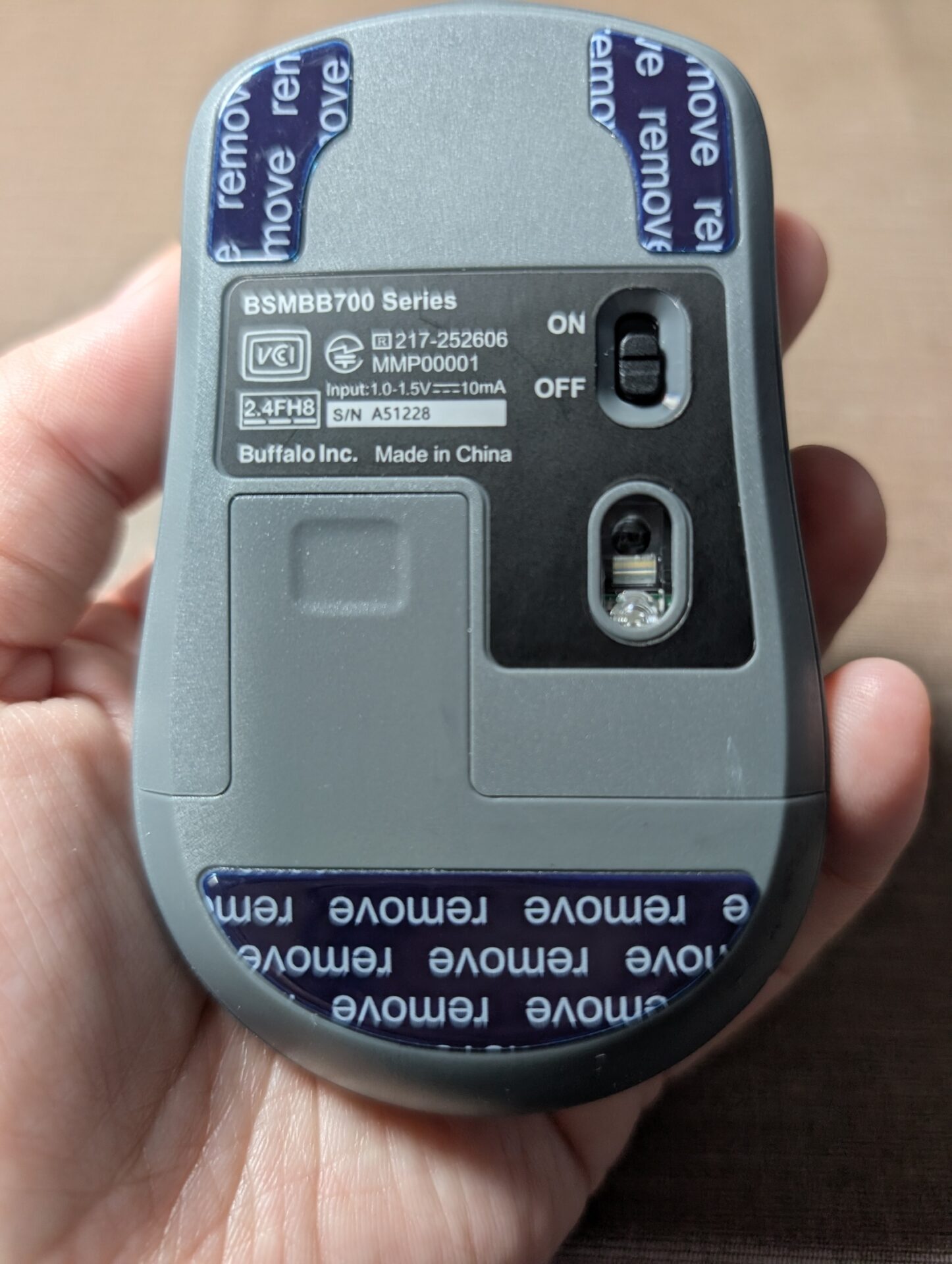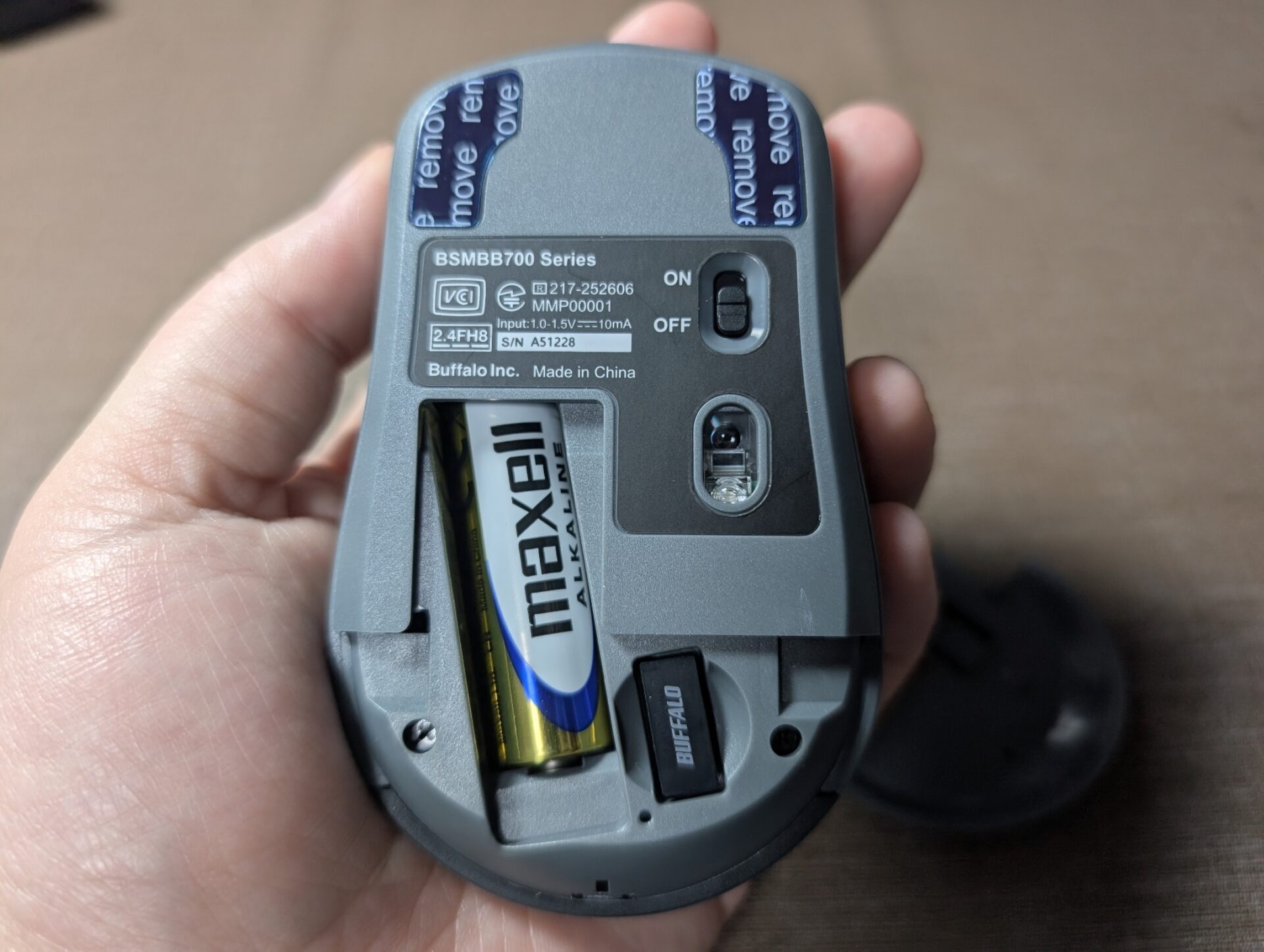 底面には電池を入れるパネルとセンサーのBlueLED、ペアリングボタン、電源スイッチがあります。パネルを開けると、無線接続用のUSB端子。パネルの内側にしまえるから、落としてなくした!ってトラブルがないのもいいですね。堅実なオフィス用品て感じ。